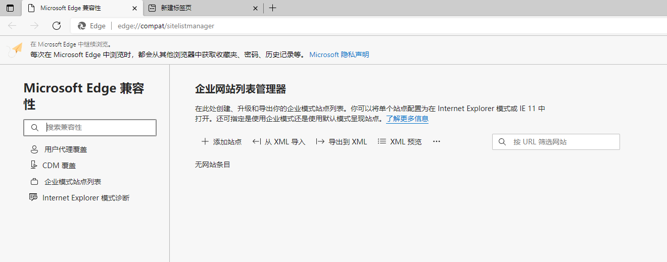 2、接着打开 Edge 浏览器并输入 edge://compat/sitelistmanager 后回车访问,点击 + 号“添加站点”。 输入域/子域,不带 http:// 或 https://。