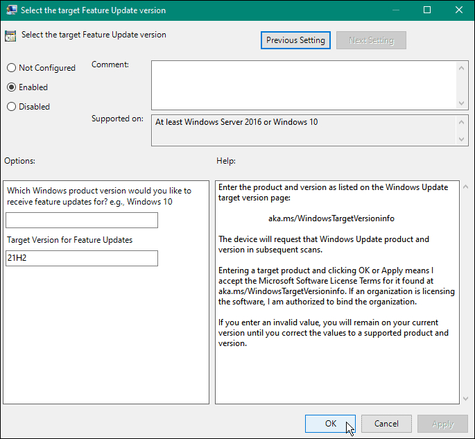 5、将其设置为已启用,然后在“功能更新的目标版本”字段中输入要保留的 Win10版本。在本例中,我们停留在21H2—单击Apply和OK。