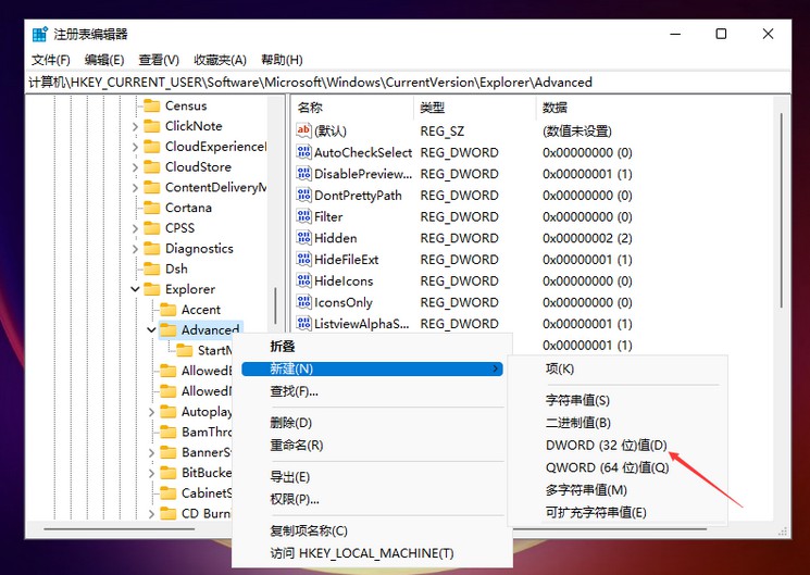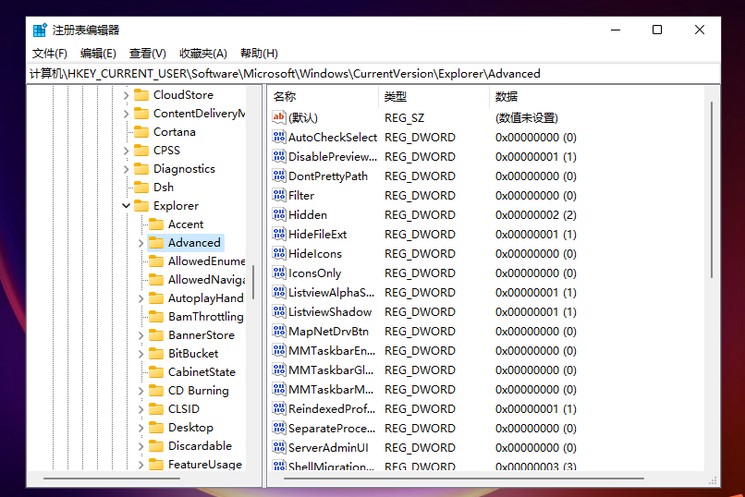 HKEY_CURRENT_USER\Software\Microsoft\ Windows\CurrentVersion\Explorer\Advanced