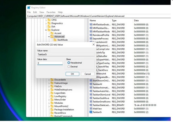 1、win11系统修改任务栏,最合适的方法是通过注册表编辑器,对数值数据进行修改实现任务栏大小的调整。
