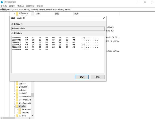 4、继续在右侧找到“FailureActions”键,右键点击修改该键的二进制数据,将“0010”、“0018”行的左起第5个数值由原来的“01”改为“00”,完成后,点击下方的“确定”即可。