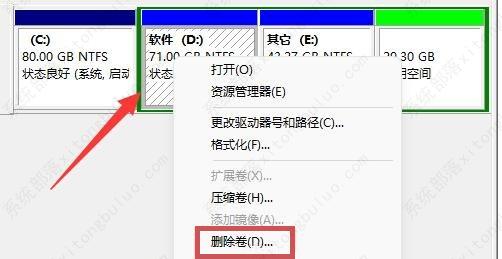 3、右键d盘,在打开的菜单项中,选择删除卷(需要备份好该分区资料)。