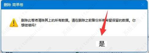 4、删除 简单卷提示,删除此卷将清除其上的所有数据。请在删除之前备份所有希望保留的数据。你想继续吗?没问题的话,点击是即可。