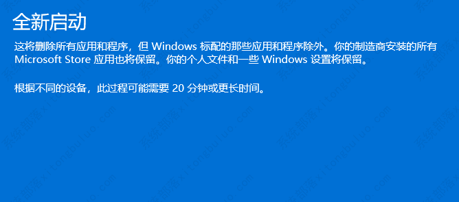 2、全新启动,这将删除所有应用和程序,但 Windows 标配的那些应用和程序除外。你的制造商安装的所有 Microsoft Store 应用也将保留。你的个人文件和一些 Windows 设置将保留。