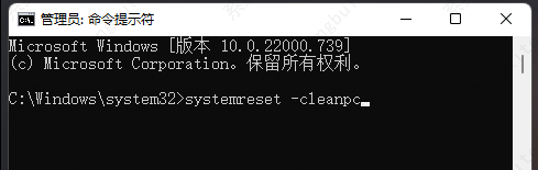 1、命令提示符中,输入并按回车执行【systemreset -cleanpc】命令,可以唤起系统重置。