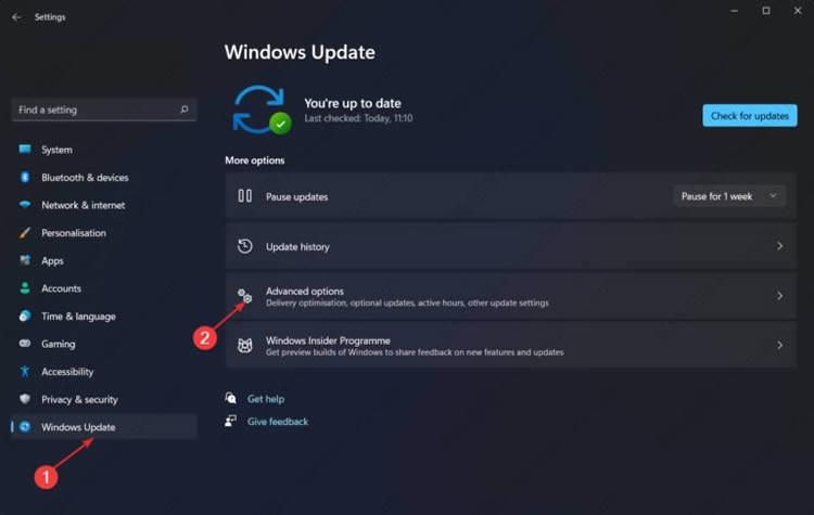 按 Windows + I 键启动设置界面并导航到左侧面板并选择Windows Update。现在从右侧选择高级选项,如下所示。