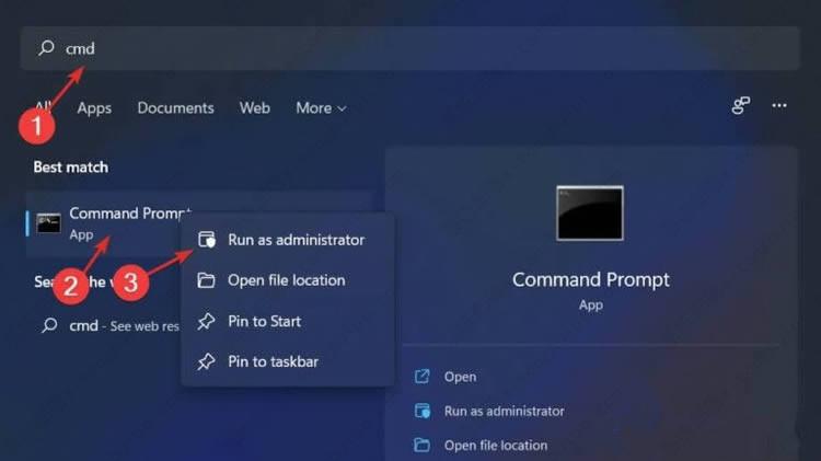 要打开命令提示符界面,您需要按Windows然后S输入cmd。最后,右键单击顶部结果并选择Run as administrator。