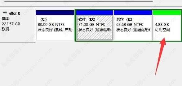 2、如下图所示,可用空间与“E盘”相邻,因此此刻d盘没法扩展,仅有E盘可以扩展。