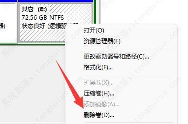 3、此刻如果我们要想扩展d盘得话,只有先备份数据好e盘文件,再右键e盘“删除卷”。
