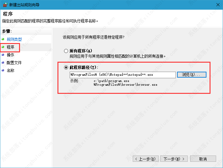 4、点击“程序”--浏览--找到需要阻止访问网络的程序。