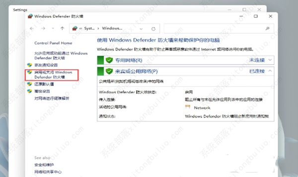 6、点击左侧的“启用或关闭windows defender防火墙”。