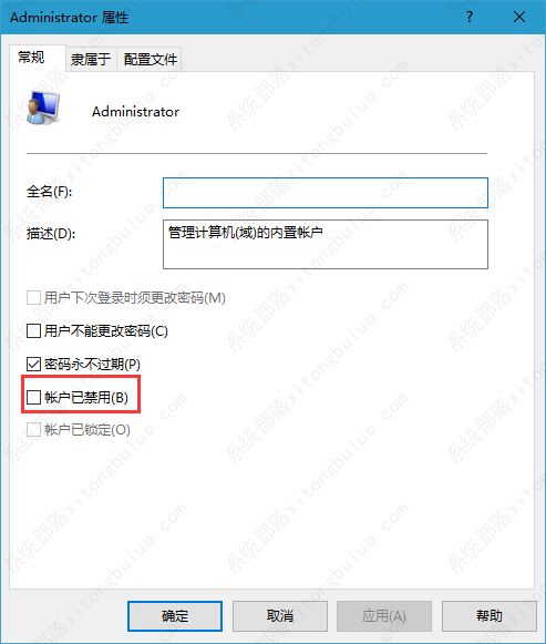4、右键点击Administrator账户,然后在打开的菜单项中选择属性,接着在Administrator属性窗口中,取消勾选账户已禁用;