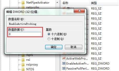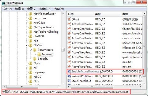 3、点击Internet,在窗口右边就会看到“EnableActiveProbing”这一项,双击,将其值改成0。