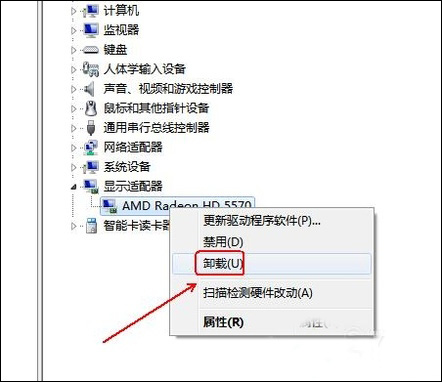 4、右击器下方的显卡驱动,在弹出的菜单列表中点击“卸载”选项。