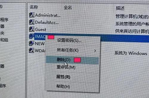 4、重复上面1.2.步骤,用带有管理员(Administrators)权限的新账户NEW,删除原有问题账户IMAC,如下图。