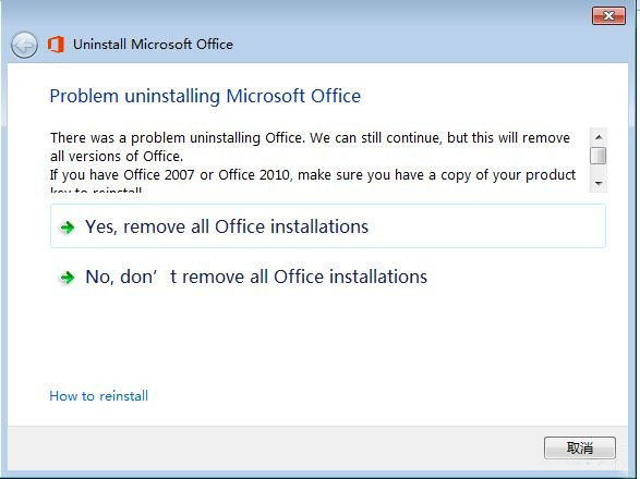 3、检测完毕后它回检测出我们电脑中其他office版本的残留文件,然后点击 yes,remove all Office installations 将残留文件清理;