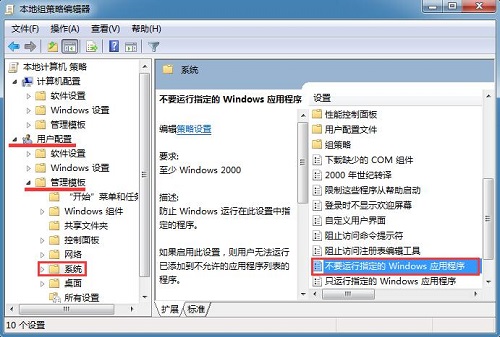 2、在打开的“本地组策略编辑器”窗口中,在左侧窗口依次展开“用户配置--管理模板--系统”,在右侧窗口找到并双击打开“不要运行指定的Windows应用程序”;