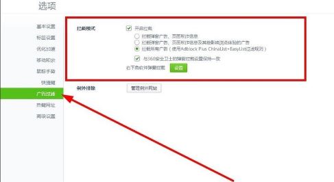 2、找到---广告过滤---拦截模式---设置你想要功能。