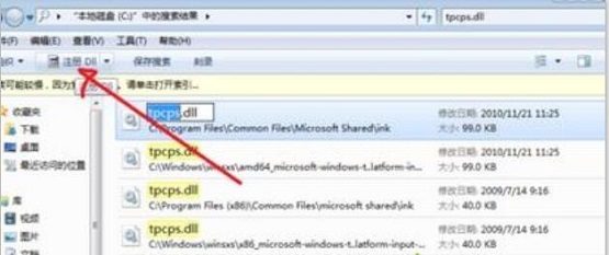 3、搜索结束后,选择任意的tpcps.dll,在箭头所示的菜单栏中,点击注册,也可以右键点击选择注册;