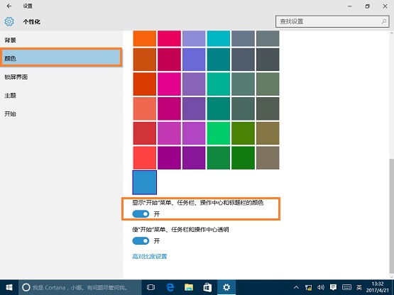 一、首先要开启Win10透明效果,具体操作是:进入设置→个性化→颜色,开启“使开始菜单、任务栏和操作中心透明”选项,如下图所示。