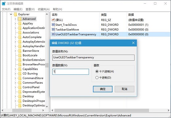打开注册表之后,依次展开:HKEY_LOCAL_MACHINESOFTWAREMicrosoftWindowsCurrentVersionExplorerAdvanced文件夹,在右侧新建名为 UseOLEDTaskbarTransparency 的 DWORD(32位)值(D),如下图所示。