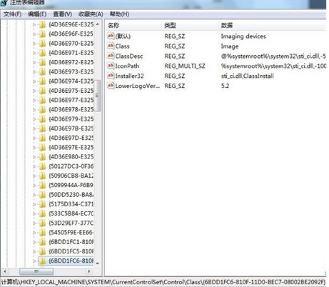 2、在打开的注册表中,左侧找到以下注册项HKEY_LOCAL_MACHINESYSTEMCurrentControlSetControlClass{6BDD1FC6-810F-11D0-BEC7-08002BE2092F} ,如下图所示: