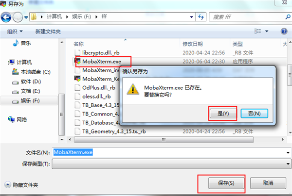 3、在弹出的选定窗口中,找到安装目录下的exe文件,点击【保存】,选择【是】;